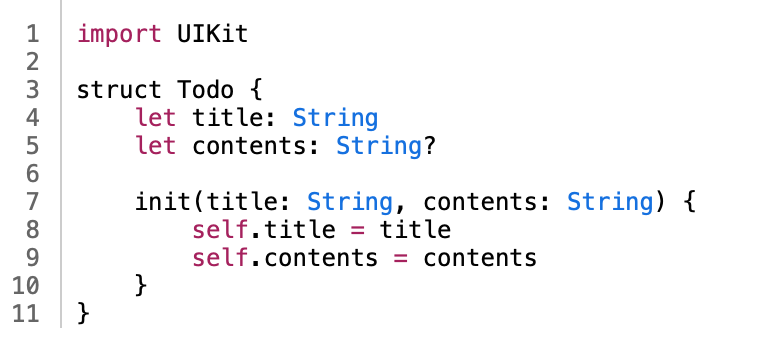 Todomodel에는 title과 내용인 contents를 만들어 주고 init을 작성해줍니다. 모델링이 끝나면 viewcontroller을 작성해봅시다.