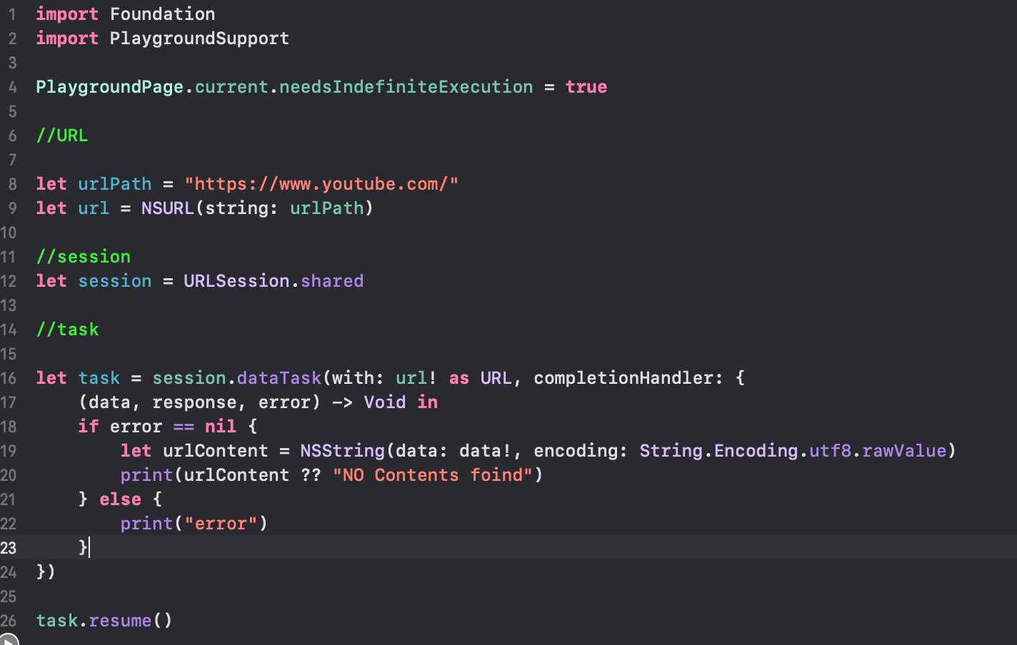 그 다음 접속에 성공하면 어떤 일을 할지 completionHandler에 작성해줍니다. 대표적으로 data, response, error을 적어줍니다. 마지막으로 task.resume()을 적어주면 성공적으로 로그창에 HTML문서가 나타납니다.